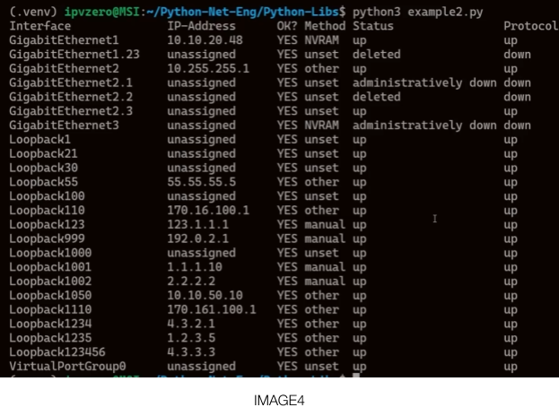 It is truly amazing that we were able to retrieve this information in less than ten lines of code. From here, it would be easy to parse this information and send out alerts via email, generate reports on the state of the network, and countless other operations. Notice the fifth column from the left is called "Status". The network is healthy, because they all say "up" or are administratively down.