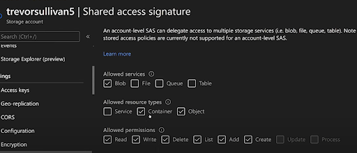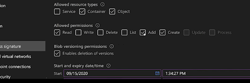 The last group of checkboxes specifies read/write settings. Of course, read/write settings also include optional permissions for delete, list, add, create, update, and process functions. Azure shared access signatures are highly granular, so make sure to select these carefully.